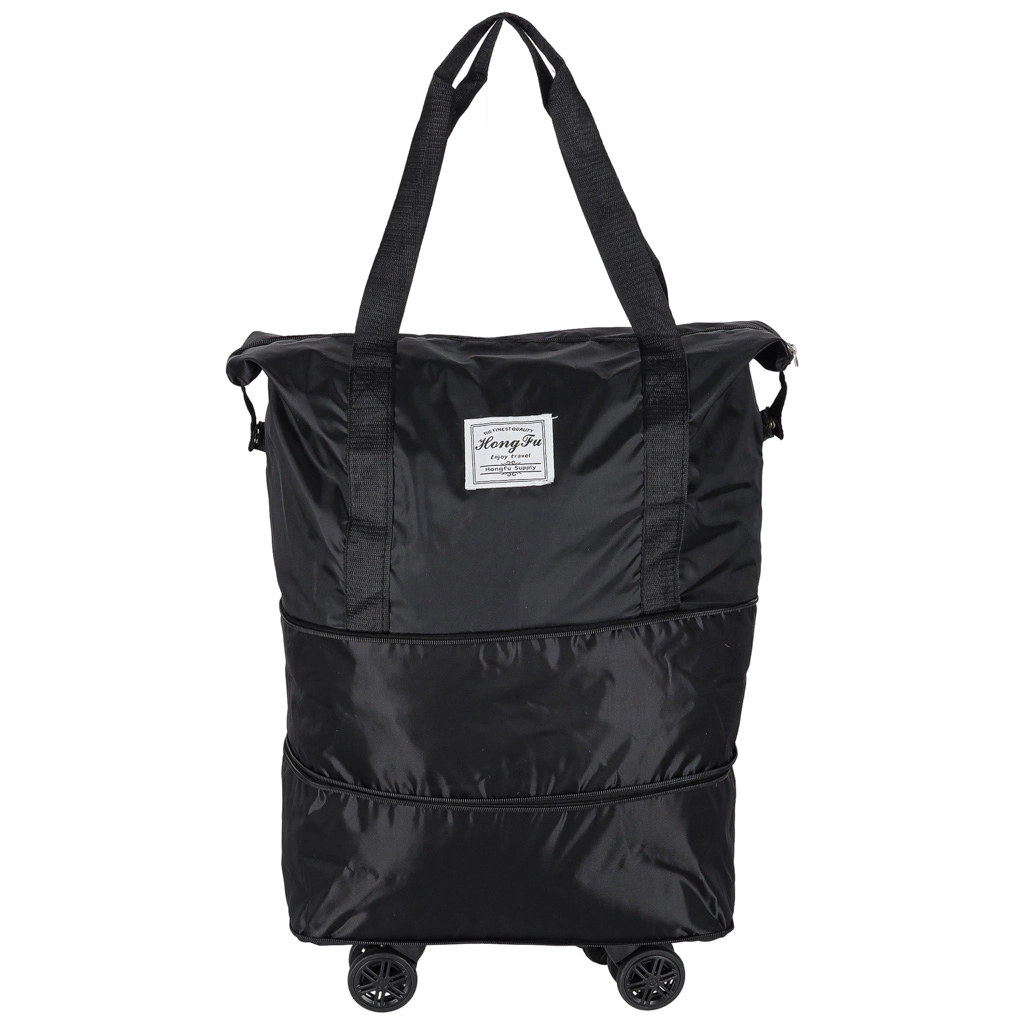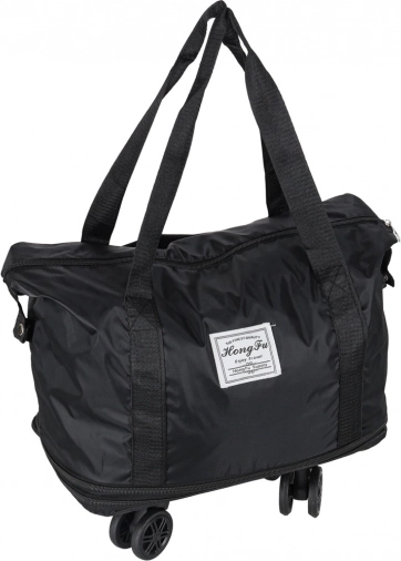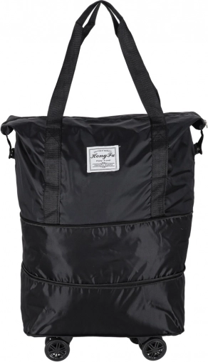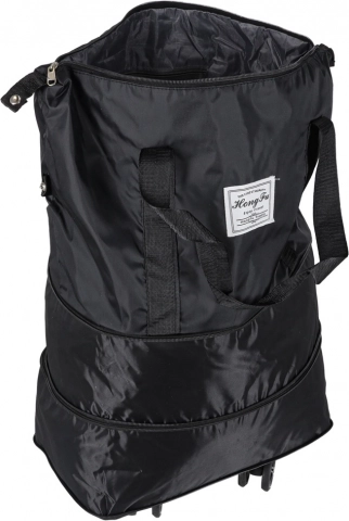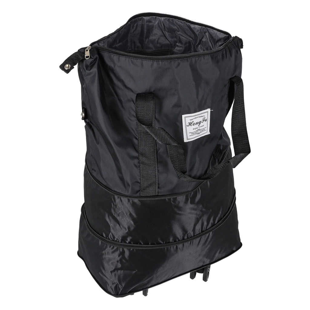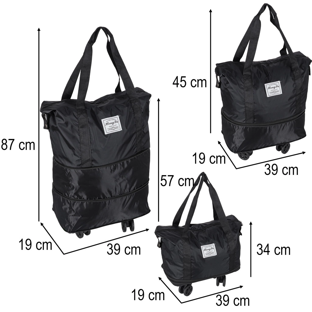 Składana torba podróżna na kółkach o pojemności ok. 50 l. Wodoodporny Oxford, odpinane kółka 360°, wiele kieszeni i trzy poziomy rozłożenia.
