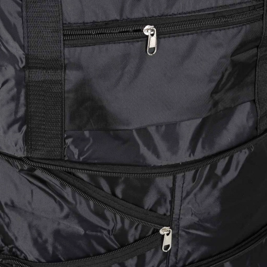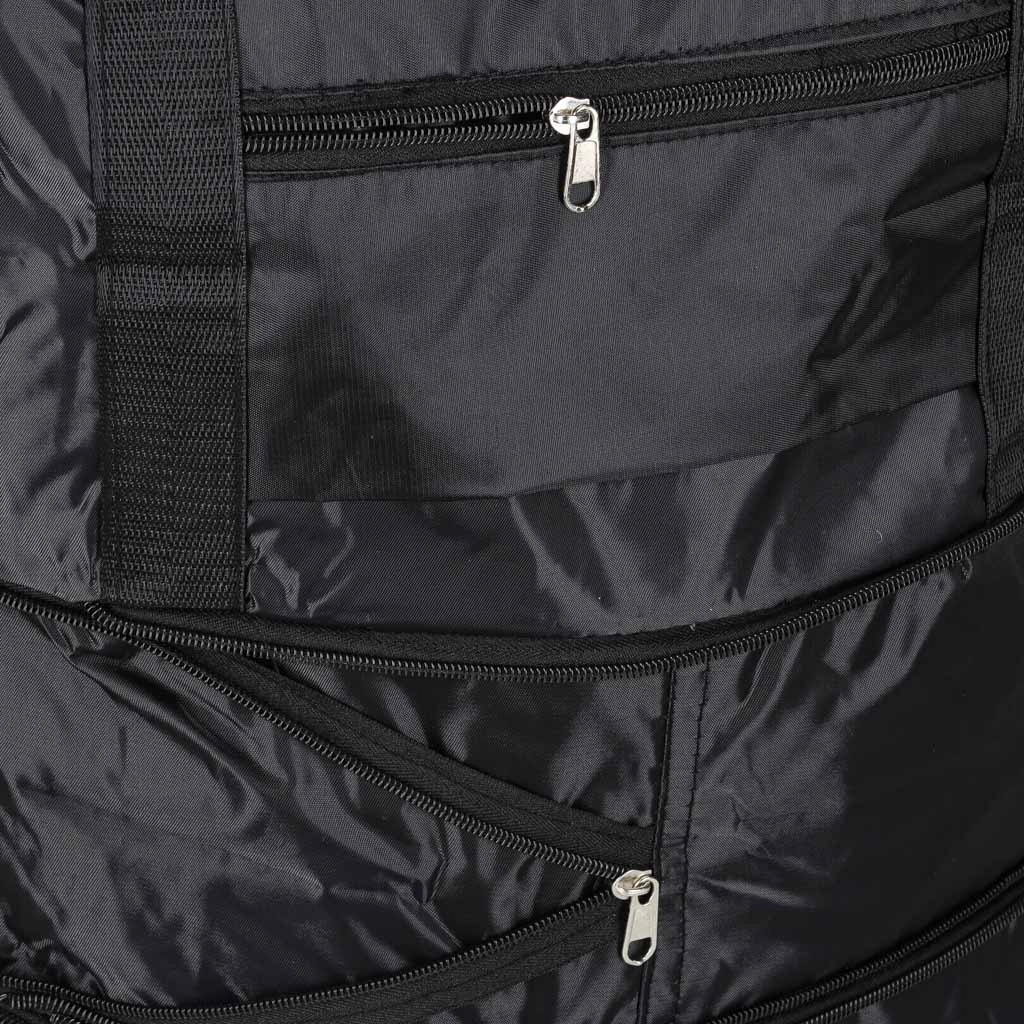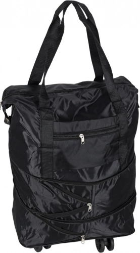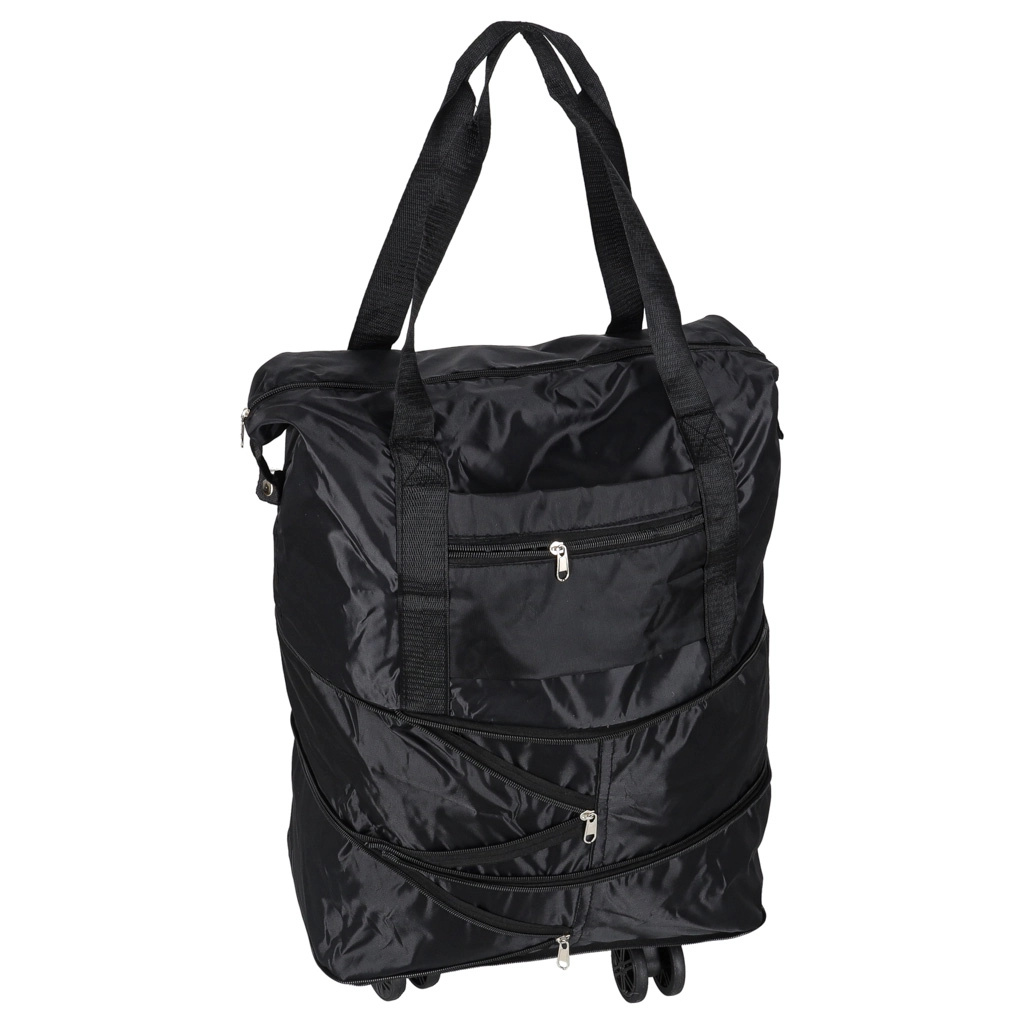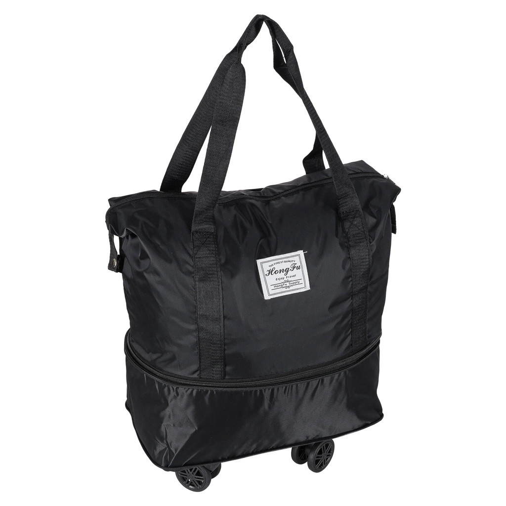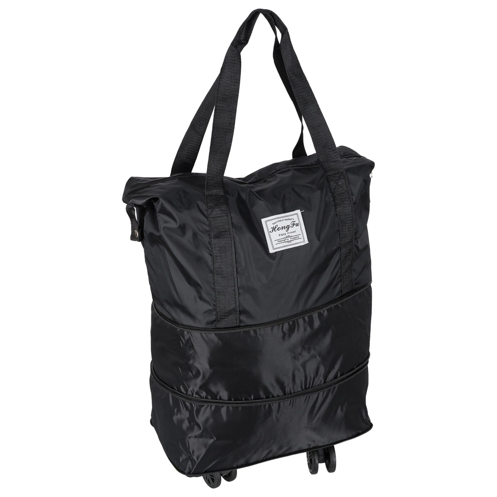 Składana torba podróżna na kółkach o pojemności ok. 50 l. Wodoodporny Oxford, odpinane kółka 360°, wiele kieszeni i trzy poziomy rozłożenia.