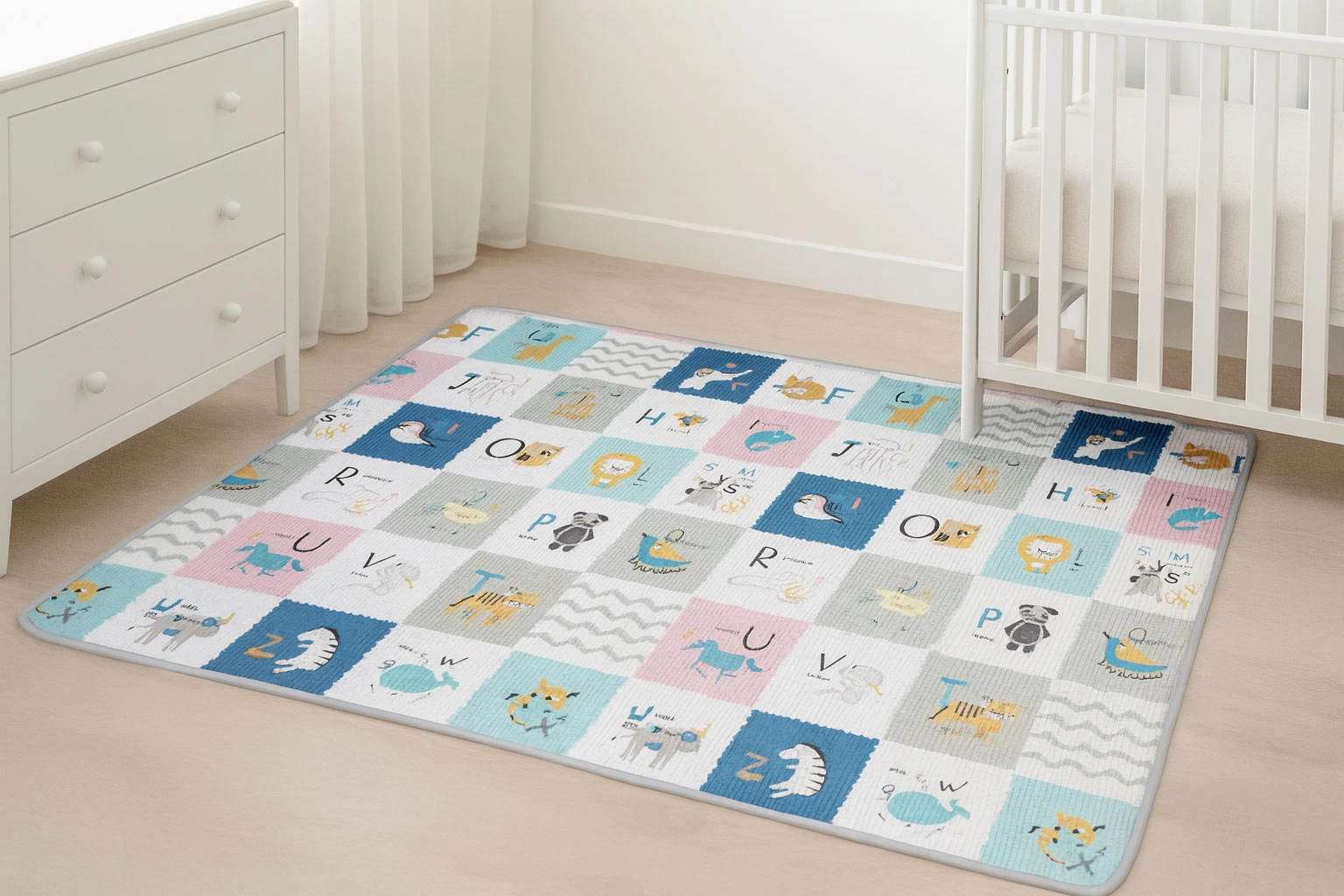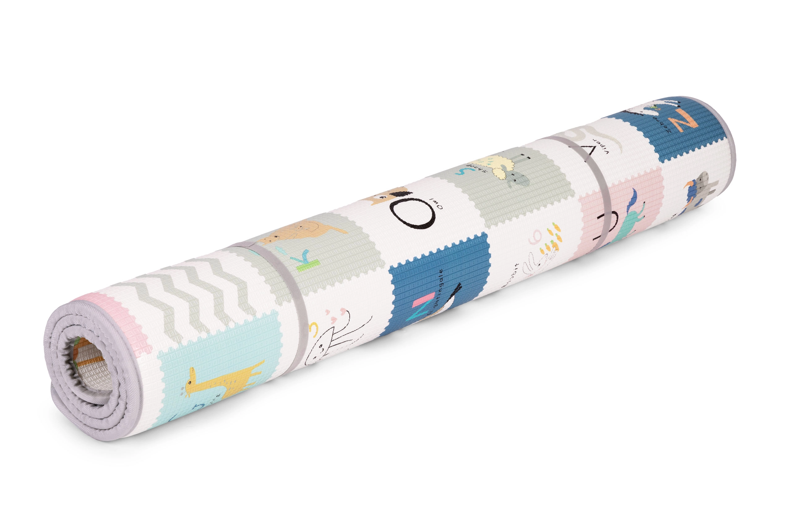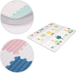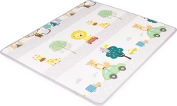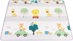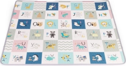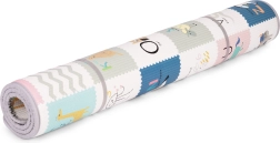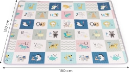 Dwustronny nadruk pobudza wyobraźnię i naukę: jedna strona oferuje wesoły alfabet z obrazkami i angielskimi słówkami, druga zwierzęta, środki transportu i przyrodę. Matę łatwo zrolujesz i zabezpieczysz paskami na rzep – idealna do sprzątania i przenoszenia do sali zabaw, do dziadków czy na wakacje.