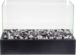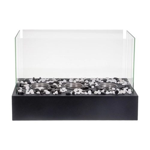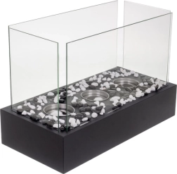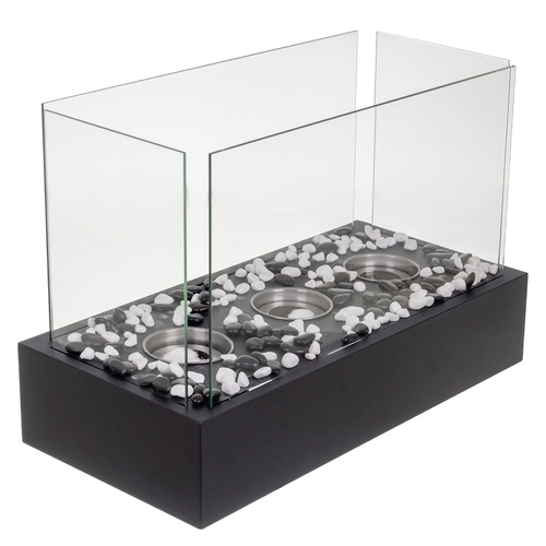 - Korpus kominka, 4 szklane ścianki, 3 zbiorniki na paliwo, 3 paleniska, białe i czarne kamyki, włókno ceramiczne, narzędzie do gaszenia, piankowe wzmocnienia, instrukcja, karton transportowy