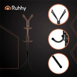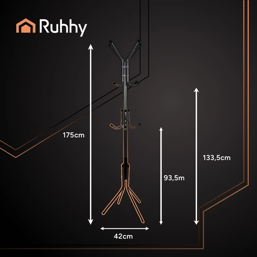 Elegancki, wolnostojący wieszak RUHHY to praktyczne i stabilne rozwiązanie do przedpokoju, sypialni, biura czy poczekalni. Dzięki trzem poziomom zawieszania, solidnej metalowej konstrukcji na 4 nogach oraz zaokrąglonym zakończeniom haczyków bezpiecznie i przejrzyście utrzyma płaszcze, kurtki, szaliki i torby. Wolnostojące wykonanie pozwala na łatwe przenoszenie bez wiercenia i narzędzi.