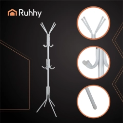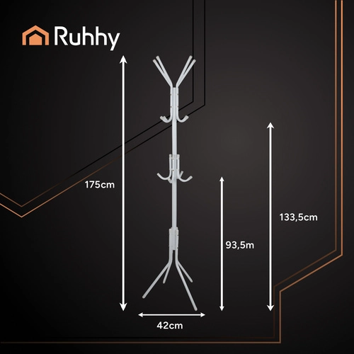 Elegancki wolnostojący wieszak RUHHY to praktyczne rozwiązanie do każdego domu i biura. Oferuje trzy poziomy zawieszania, stabilną metalową konstrukcję na 4 solidnych nóżkach oraz uniwersalne zastosowanie od przedpokoju po poczekalnię. Łatwy w utrzymaniu, wolnostojący i niewymagający wiercenia ani specjalnych narzędzi.