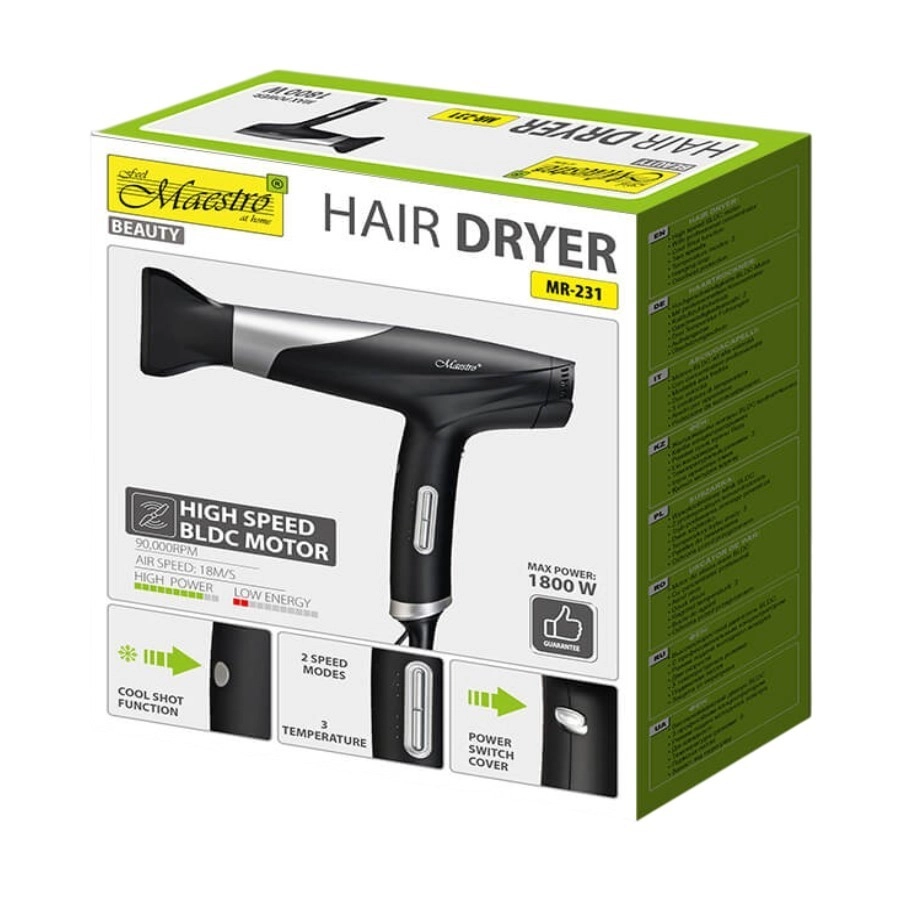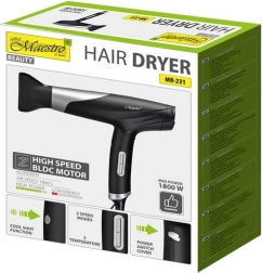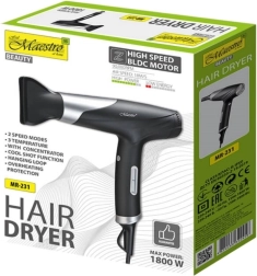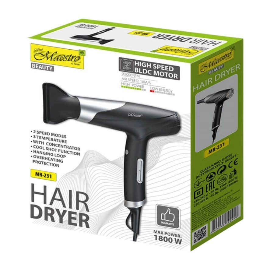 MAESTRO MR-231 to niezawodna suszarka zaprojektowana do efektywnej, codziennej pielęgnacji włosów. Wysoka moc 1800 W w połączeniu z silnikiem BLDC 90 000 obr./min gwarantuje szybkie rezultaty nawet przy gęstych i długich włosach. Prędkość przepływu 18 m/s skraca czas suszenia i pomaga chronić włosy przed nadmiernym ciepłem.