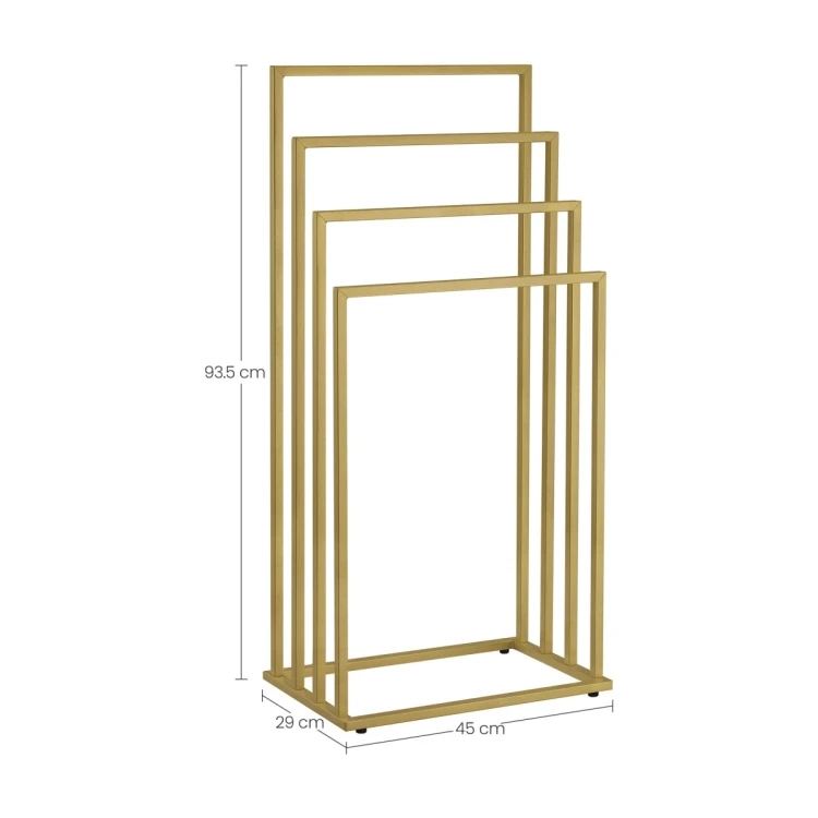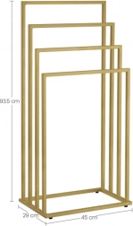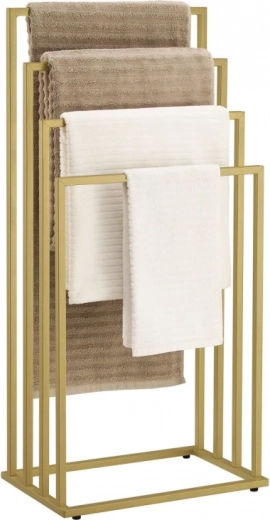 Wnieś do łazienki porządek i styl. Cztery schodkowo ułożone ramiona umożliwiają cyrkulację powietrza dla szybszego schnięcia ręczników, szlafroków i strojów kąpielowych. Minimalistyczna rama w matowym złocie pasuje do nowoczesnych i klasycznych wnętrz, a pionowe rozwiązanie oszczędza miejsce.