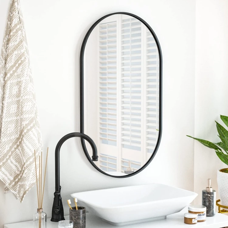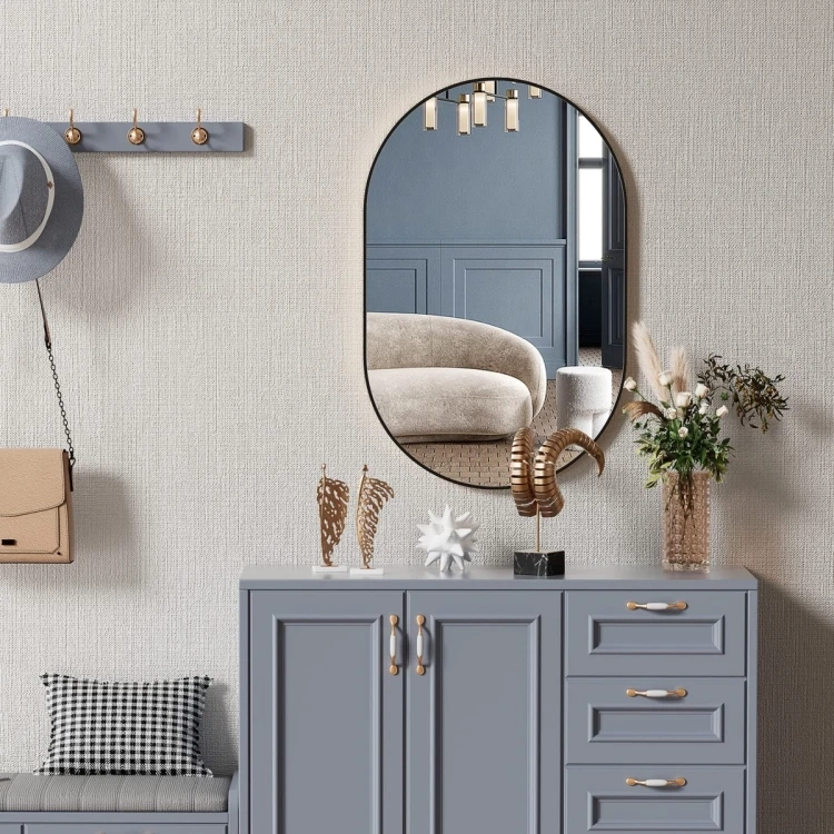 Uniwersalne owalne lustro to funkcjonalny i dekoracyjny element, który rozjaśnia przestrzeń i dodaje jej elegancji. Duża powierzchnia odbicia jest idealna do sprawdzania stroju, makijażu lub stylowego dopełnienia wystroju. Cienka czarna aluminiowa rama podkreśla minimalistyczny i nowoczesny wygląd, który łatwo dopasujesz do różnych aranżacji.