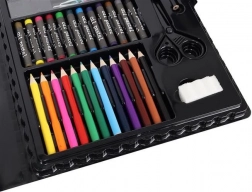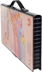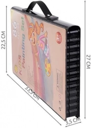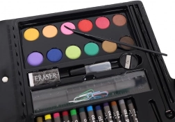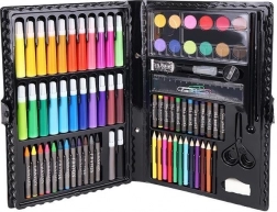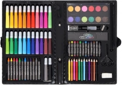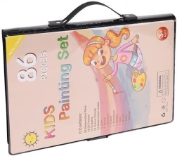 Zestaw do malowania zawiera 86 elementów, które oferują szeroki wybór do rysowania i malowania – 12 kredek pastelowych, 24 flamastry, 12 pasteli olejnych, 12 pasteli woskowych, 12 farb akwarelowych, gąbkę, gumkę, pędzel, nożyczki, ołówek, temperówkę, klej, linijkę, paletę malarską i 5 kolorowych spinaczy.