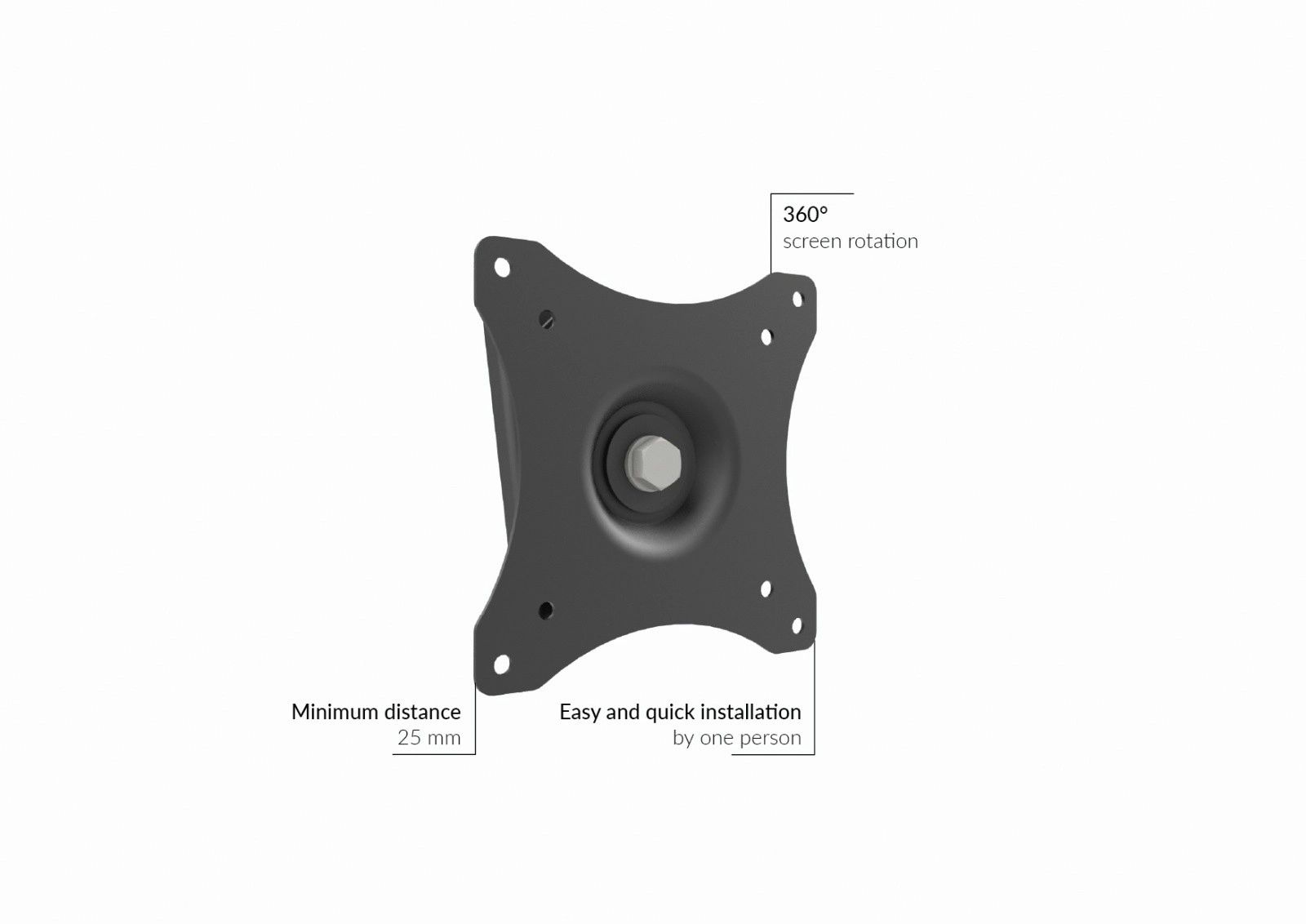 Praktyczny i kompaktowy uchwyt do monitorów i małych telewizorów o przekątnej 10–29″ jest idealny tam, gdzie potrzebne jest oszczędne rozwiązanie z minimalnym odsunięciem od ściany. Konstrukcja umożliwia obrót ekranu o 360°, dzięki czemu łatwo przełączysz wyświetlacz między orientacją poziomą i pionową. Metalowe korpus o smukłym profilu (zaledwie 25 mm od ściany) zachowuje czysty wygląd wnętrza.