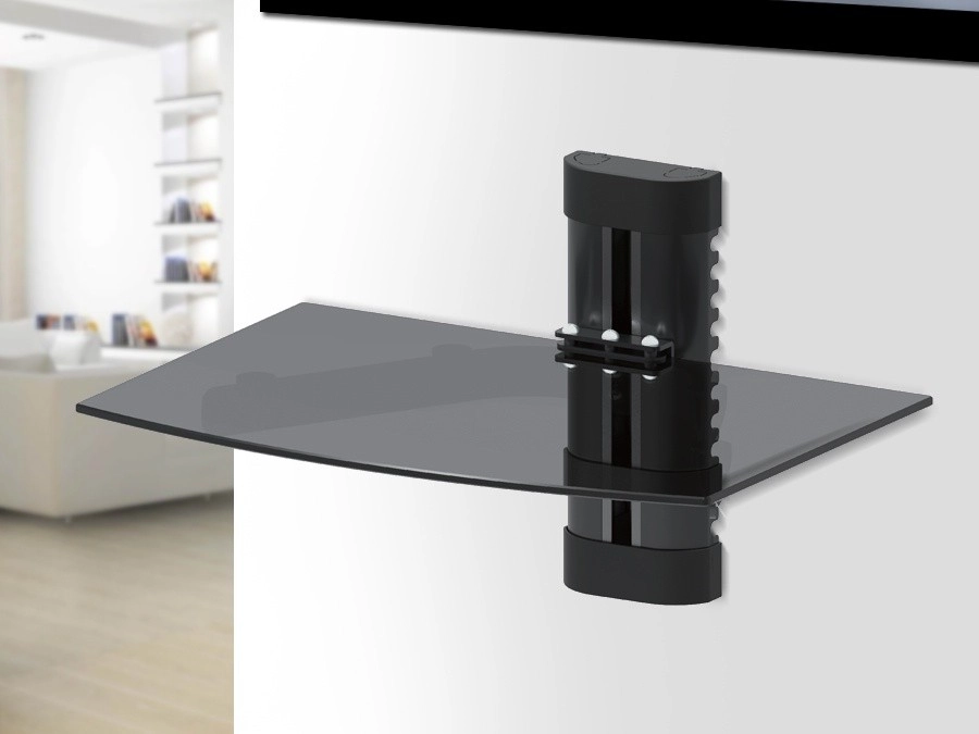 Stylowa ścienna półka z hartowanego szkła do urządzeń AV oferuje bezpieczne przechowywanie odtwarzaczy DVD/BD, dekoderów set-top box czy konsol do 8 kg. Łączy eleganckie czarne szkło, solidny metalowy wspornik oraz zintegrowane prowadzenie kabli dla czystego i nowoczesnego wyglądu pod telewizorem.