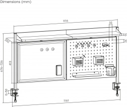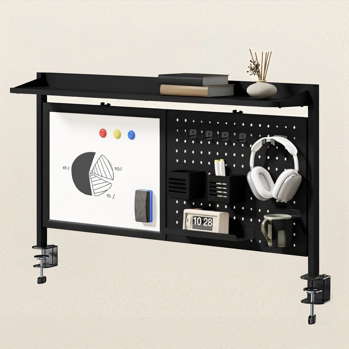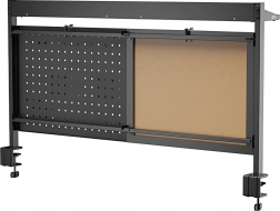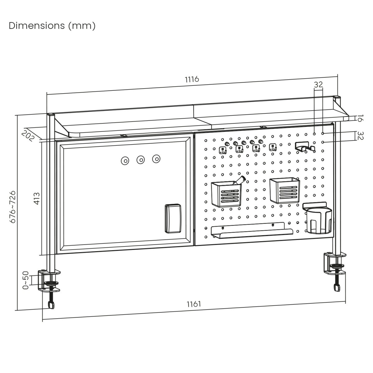 Utrzymuj porządek na biurku dzięki kompaktowej nadstawce z solidnymi metalowymi zaciskami, magnetyczną tablicą suchościeralną oraz perforowanym panelem metalowym do swobodnego rozmieszczenia akcesoriów. Górna wąska półka na pełną szerokość zapewnia dodatkowe miejsce odkładcze, a haczyki, kubeczki i półeczki sprawią, że będziesz mieć wszystko pod ręką bez wiercenia w blacie.