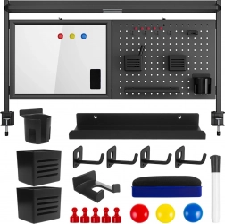 Ta wielofunkcyjna nadstawka zamieni każde biurko w przejrzystą i efektywną strefę pracy. Stabilne mocowanie za pomocą metalowych zacisków typu C oszczędza miejsce i nie wymaga wiercenia. Magnetyczna tablica suchościeralna jest idealna do szybkich notatek, zadań czy pomysłów, które łatwo zetrzesz dołączoną gąbką, a panel perforowany pozwala dowolnie przestawiać uchwyty i koszyki zgodnie z potrzebami.