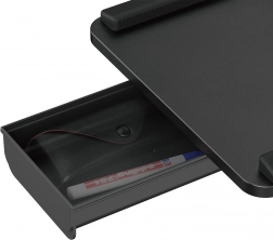 Zintegrowana boczna szufladka pomieści drobne akcesoria, a podwyższone ranty dookoła zapobiegają spadaniu klawiatury czy myszy.