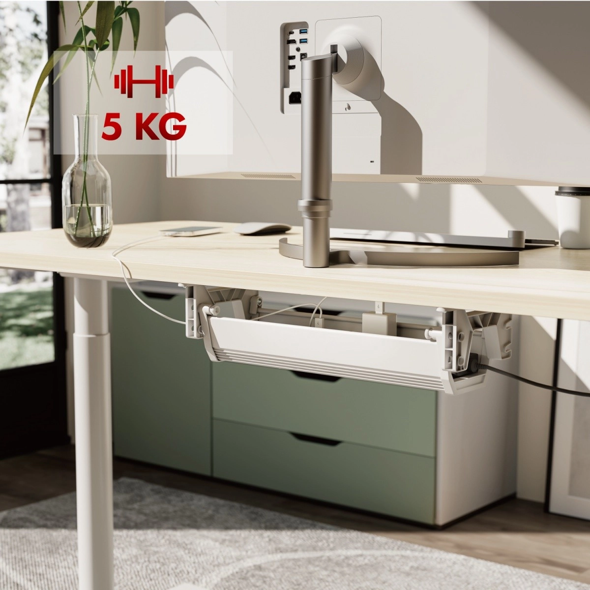 Organizer pozwala na montaż w dwóch pozycjach wysokości, aby dopasować przestrzeń do urządzeń. Szybki dostęp zapewnia wygodny system otwierania bez konieczności demontażu. Neutralny design w kolorze biało-szarym dyskretnie wtapia się w większość biurek i wnętrz.