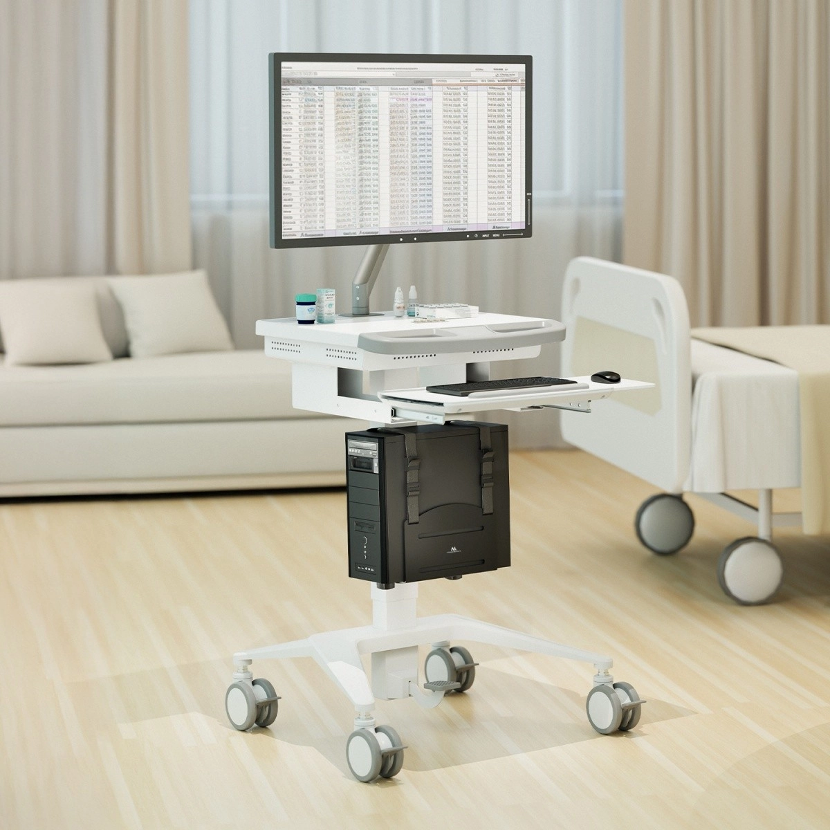 Montaż na ścianie lub pionowym słupku zwalnia przestrzeń pod biurkiem i porządkuje okablowanie dla lepszej ergonomii.