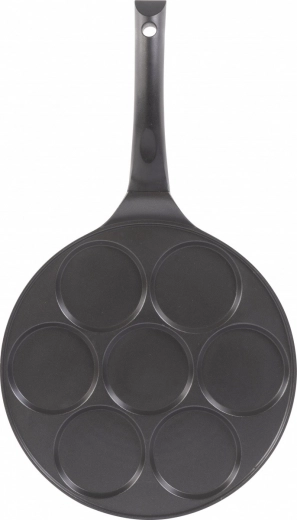 Praktyczna aluminiowa patelnia do 7 placuszków o średnicy 27 cm do szybkiego i zdrowego przygotowania śniadań. Dzięki nieprzywierającej powłoce bez PFOA ciasto się nie przypala, łatwo się czyści i równomiernie rozprowadza ciepło. Solidna konstrukcja z grubym dnem i elegancką stalową rączką zapewnia wygodne i bezpieczne gotowanie.