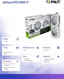 Palit GeForce RTX 5060 Ti White OC została zaprojektowana dla graczy i twórców, którzy chcą połączyć czysty biały wygląd z efektywnym chłodzeniem i stabilną wydajnością. Dwa 95‑milimetrowe wentylatory osiowe zapewniają cichą pracę i niezawodne odprowadzanie ciepła, a 2‑slotowa konstrukcja ułatwia montaż w bardziej kompaktowych obudowach PC.