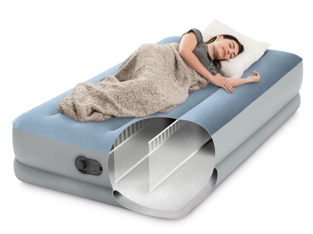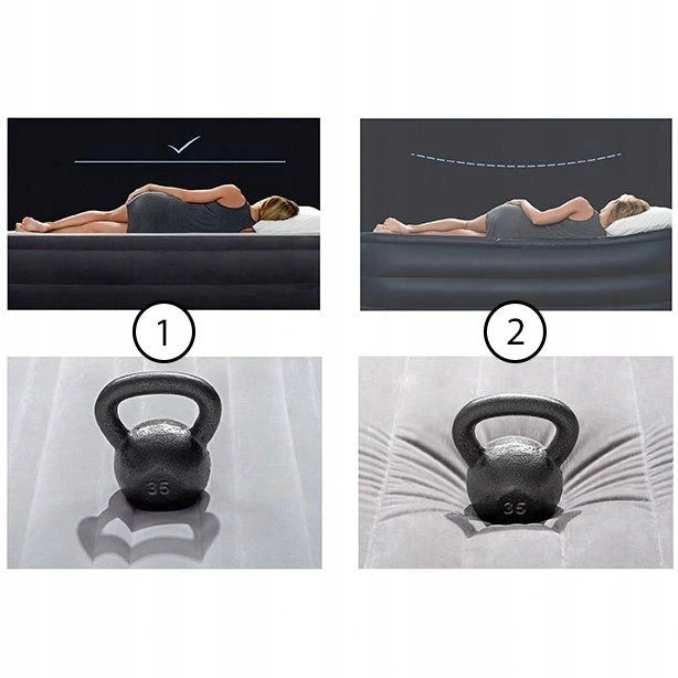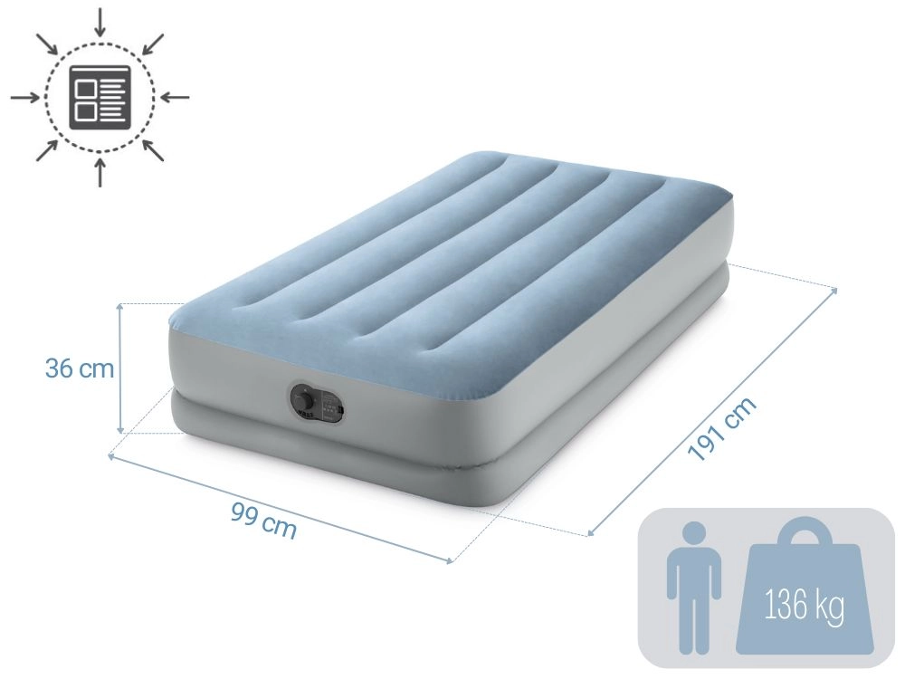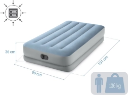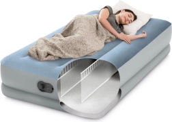 Szukasz wygodnego rozwiązania dla gości, w podróży lub na działkę? Nadmuchiwana mata/łóżko Intex łączy komfort, stabilność i mobilność. Welurowa powierzchnia jest przyjemna w dotyku i zapobiega ślizganiu się prześcieradła, a wzmocnione komory Fiber-Tech oraz rama Dura-Beam nadają łóżku sztywność bez nieprzyjemnego kołysania.