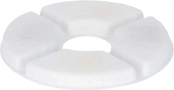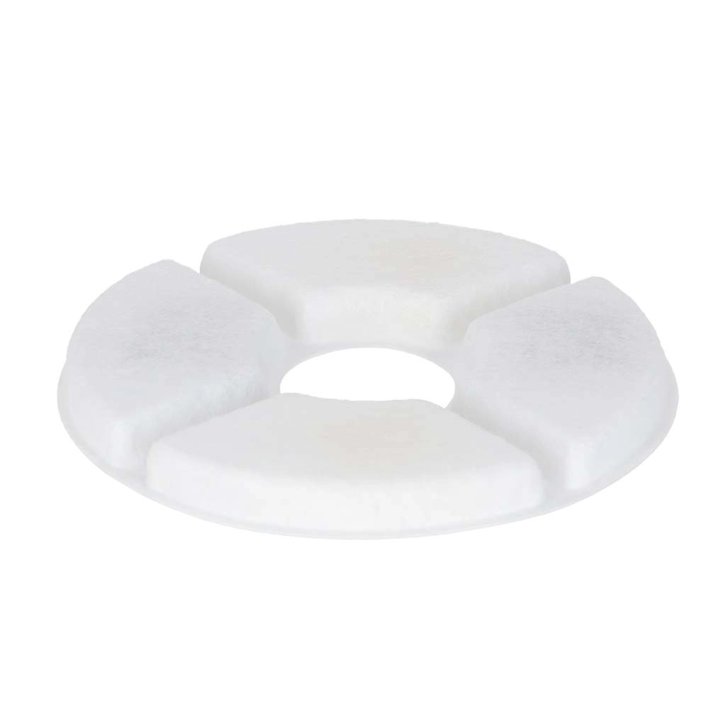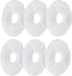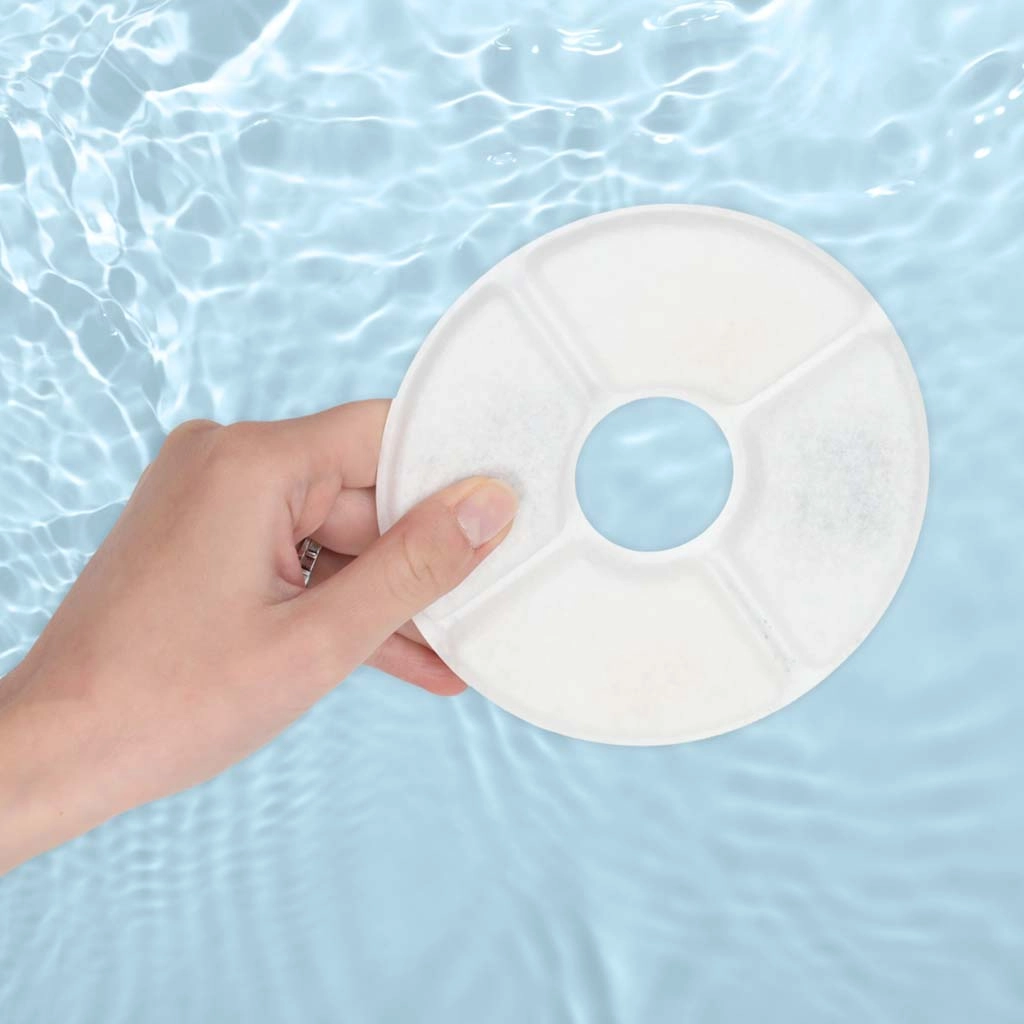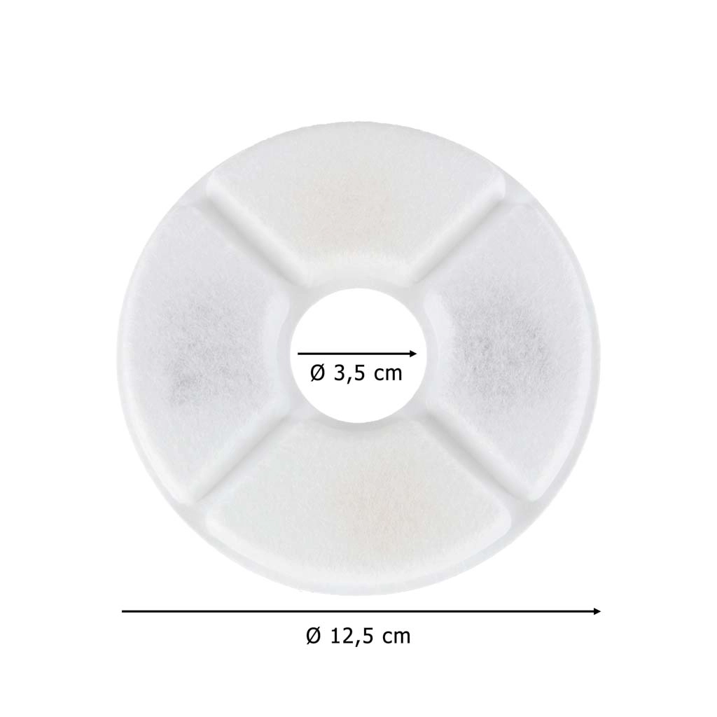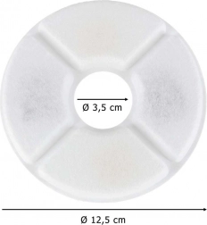 Filtry mają średnicę 12,5 cm i otwór centralny 3,5 cm, dzięki czemu łatwo pasują do większości okrągłych fontann z centralnym słupkiem. Montaż jest szybki i bez narzędzi – wystarczy włożyć, przepłukać i używać.