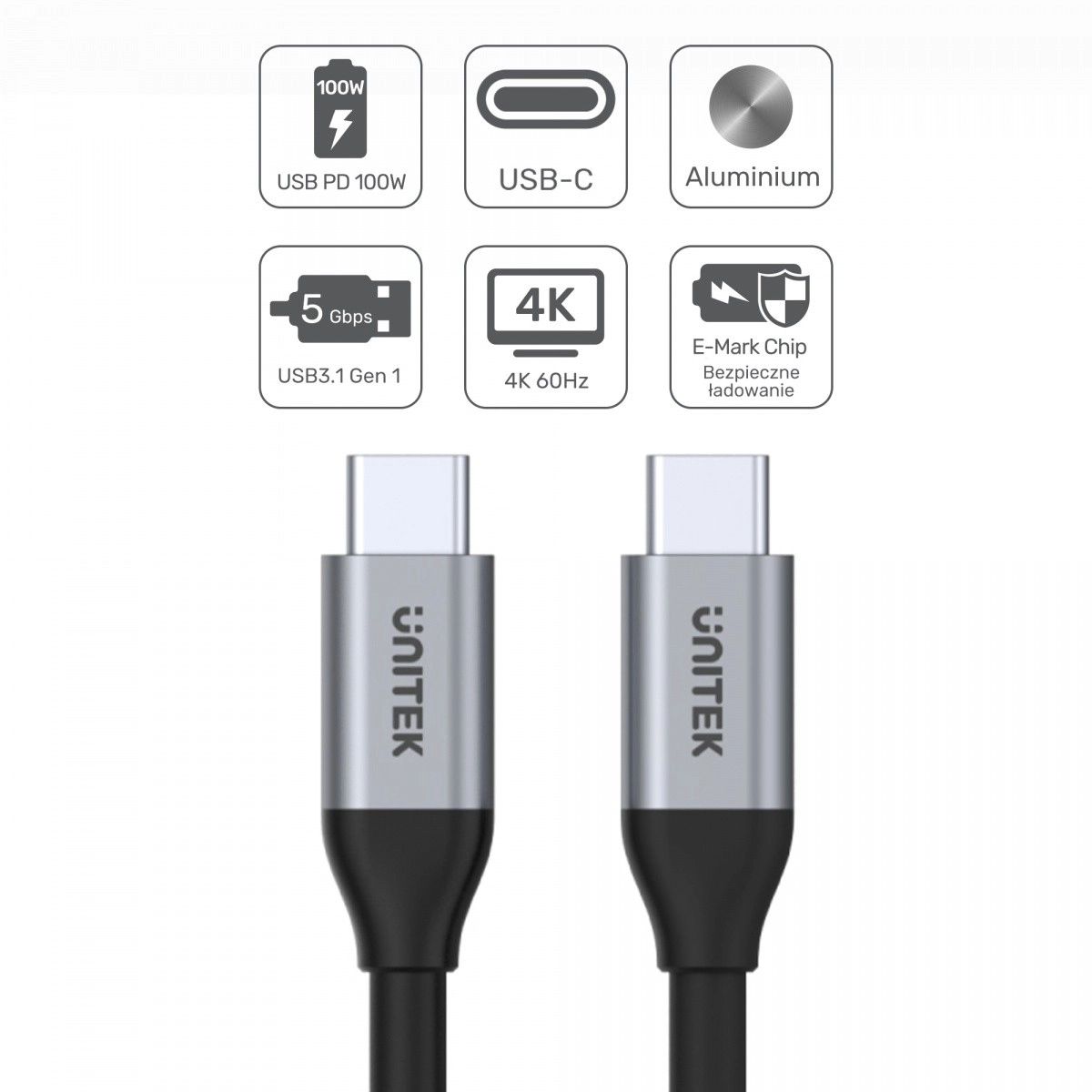 Uniwersalny kabel USB‑C ↔ USB‑C o długości 2 m do szybkiego przesyłania danych, obrazu i zasilania. Oferuje do 100 W Power Delivery, transfer danych 5 Gbps (USB 3.1 Gen 1) oraz wideo do 4K przy 60 Hz. Dzięki układowi E‑MARK i aluminiowym złączom połączenie jest szybkie, stabilne i bezpieczne.