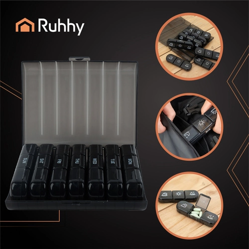 Praktyczny tygodniowy organizer na leki RUHHY pomaga utrzymać porządek i regularność dawkowania przez cały tydzień. Zawiera 7 wyjmowanych pojemników z czytelnym oznaczeniem dni oraz podziałem na rano, południe i wieczór. Dzięki solidnemu etui jest kompaktowy, bezpieczny i idealny do domu, pracy oraz w podróży.