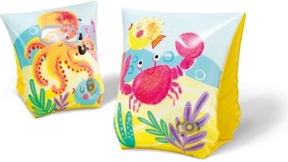 Rękawki mają zabawne ilustracje meduz, ośmiornic i krabów w jaskrawych kolorach na żółtym tle, co zachęca dzieci do pływania.