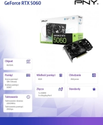 PNY GeForce RTX 5060 8GB oferuje świetny stosunek wydajności do efektywności w kompaktowej, dwuslotowej konstrukcji. Dwa duże wentylatory osiowe i masywny aluminiowy radiator z heatpipe’ami utrzymują temperatury i hałas w ryzach, a metalowy backplate zwiększa sztywność i poprawia odprowadzanie ciepła. Idealny wybór do grania w wysokim FPS, streamingu oraz przyspieszania aplikacji kreatywnych.