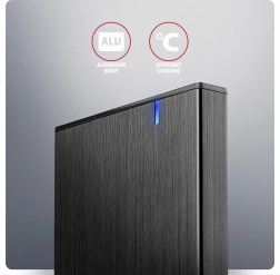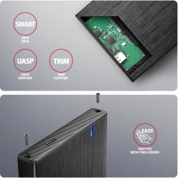 Obudowa wspiera TRIM dla długotrwałej kondycji SSD, odczyt danych S.M.A.R.T., automatyczne usypianie dysku oraz bezproblemowe Plug & Play wraz z Hot Plug. Szlifowana powierzchnia wygląda czysto i ogranicza widoczność odcisków palców.