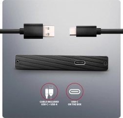 Elegancka aluminiowa obudowa chroni dysk i jednocześnie zapewnia efektywne odprowadzanie ciepła. Dwustronny złącze USB‑C oraz dołączony kabel USB‑C → USB‑A ułatwiają podłączenie do komputera. Dzięki SATA 6G i UASP w pełni wykorzystasz prędkości nowoczesnych SSD.