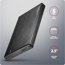 Kompaktowa i wytrzymała aluminiowa zewnętrzna obudowa AXAGON dla dysków 2.5" SSD/HDD oferuje USB‑C 3.2 Gen 1 z prędkością do 5 Gbps, wsparcie UASP dla wyższej wydajności SSD, TRIM, S.M.A.R.T. oraz niezawodne chłodzenie dzięki aluminiowemu korpusowi z szlifowaną powierzchnią.
