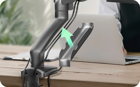 Praktyczne zintegrowane prowadzenie kabli ukrywa okablowanie pod ramieniem, zmniejszając bałagan i ryzyko potknięcia. Uchwyt oferuje podwójny sposób montażu – zacisk do krawędzi blatu oraz montaż przez przepust – zapewniając bezpieczne i uniwersalne mocowanie do większości biurek. Kompatybilność z VESA 75×75 i 100×100 gwarantuje szybki montaż większości standardowych monitorów.