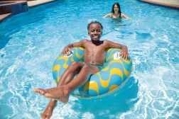 Bezpieczny dla zdrowia winyl o grubości 0,23 mm wytrzymuje letnie obciążenia i zapewnia długotrwałe użytkowanie w basenie i nad morzem.