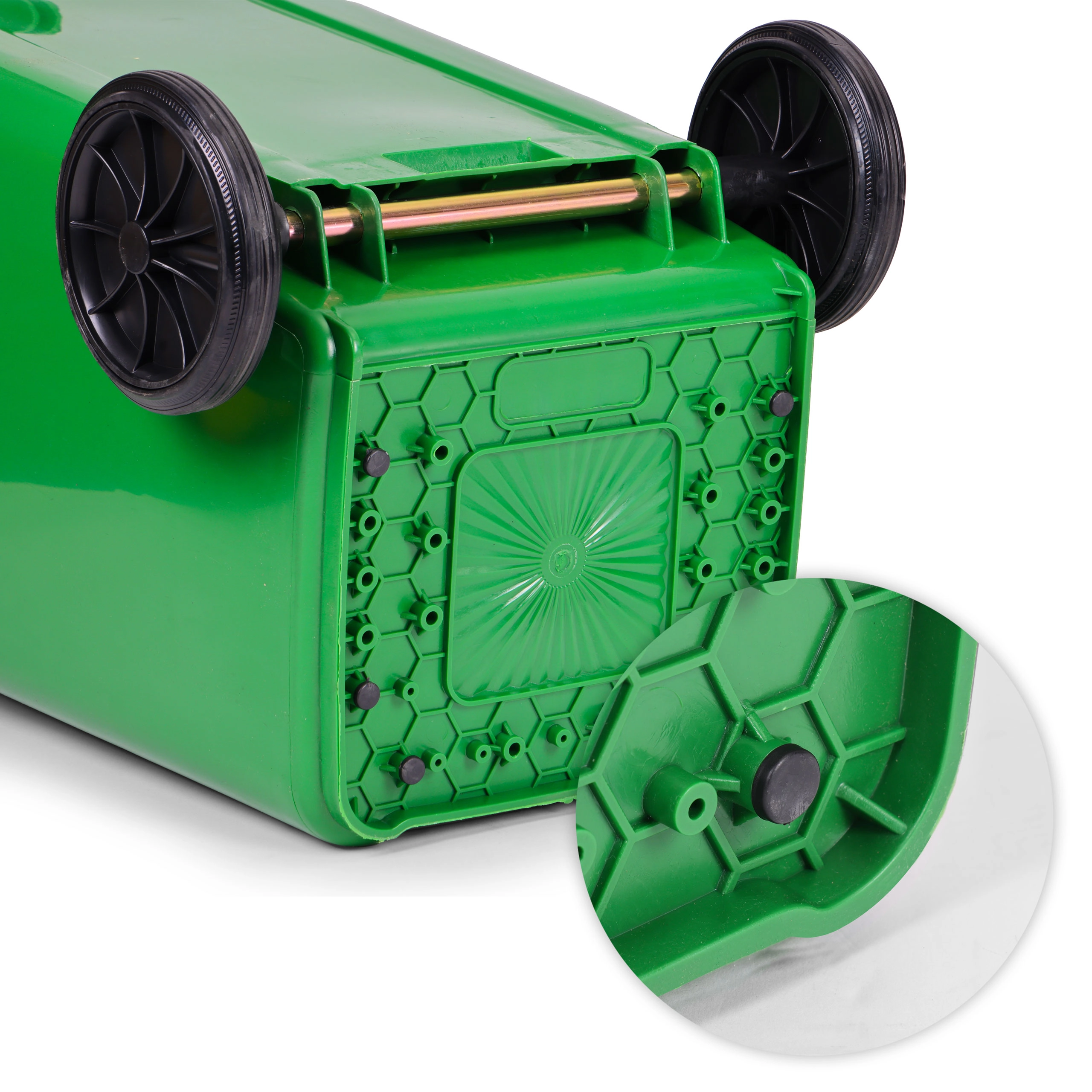 Do wygodnego przemieszczania służą gumowe koła na metalowej osi oraz ergonomiczne uchwyty z antypoślizgowym profilem. Nóżki stabilizujące ograniczają przesuwanie po mokrej powierzchni i chronią podłogę przed zarysowaniami. Pojemnik jest w pełni kompatybilny z pojazdami komunalnymi zgodnie z EN 840, a dzięki normom ISO9001, ISO14001, ISO45001 spełnia wysokie wymagania jakości i bezpieczeństwa.