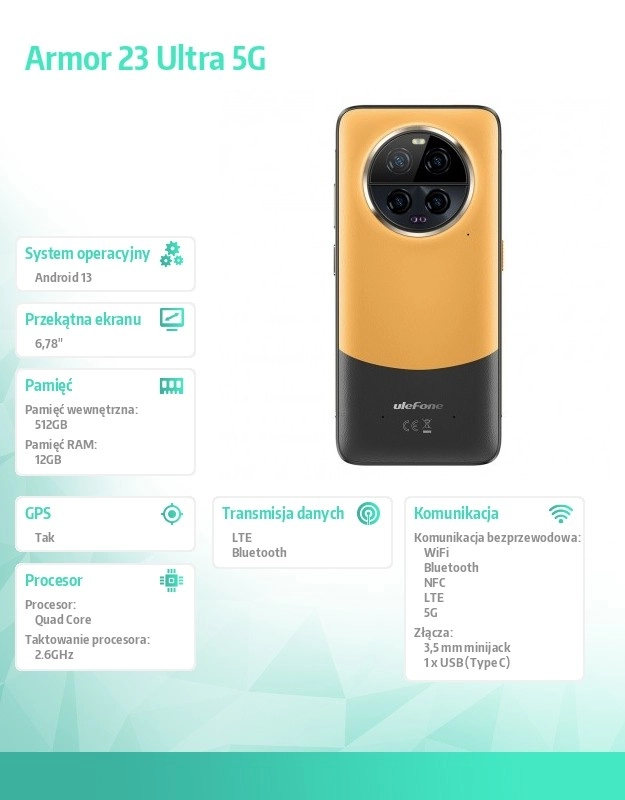 ARMOR 23 ULTRA 5G łączy topową wytrzymałość z nowoczesną łącznością i dużą pojemnością pamięci. Konstrukcja o podwyższonej odporności oraz teksturowane plecki zapewniają pewny chwyt, a wieloobiektywowy okrągły moduł aparatu oferuje elastyczność w codziennym fotografowaniu i filmowaniu. Duży ekran z wąskimi ramkami gwarantuje wygodne przeglądanie treści, nawigację i pracę w wymagających warunkach.