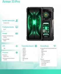 Monstrualna 25 500 mAh bateria wytrzyma dni bez ładowania, wsparcie 66 W skraca czas uzupełniania energii, a 10 W ładowanie zwrotne ożywi Twoje inne urządzenia. Z certyfikatami IP68/IP69K i MIL‑STD‑810H Armor 33 Pro nie boi się wody, kurzu ani uderzeń. Oczywistością są 5G, Wi‑Fi 6, Bluetooth 5.4, NFC, precyzyjna nawigacja oraz praktyczne złącze 3,5 mm i USB‑C.