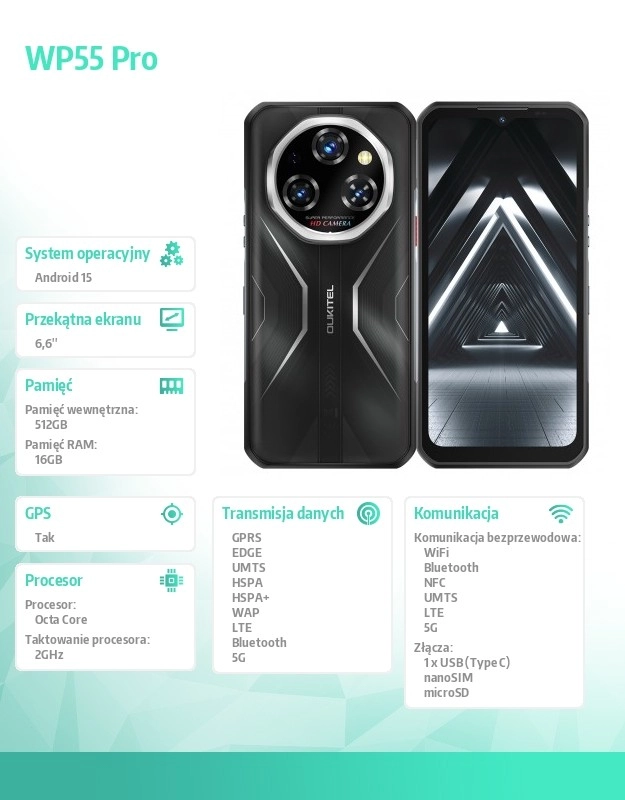 Szukasz telefonu, który sprosta wymagającej pracy i przygodom w terenie? OUKITEL WP55 Pro łączy najwyższą wytrzymałość z nowoczesną wydajnością i wyposażeniem. Certyfikaty IP68, IP69K i MIL‑STD‑810H chronią przed kurzem, wodą oraz upadkami z wysokości do 1,5 m, a solidna obudowa z antypoślizgową fakturą zapewnia pewny chwyt.