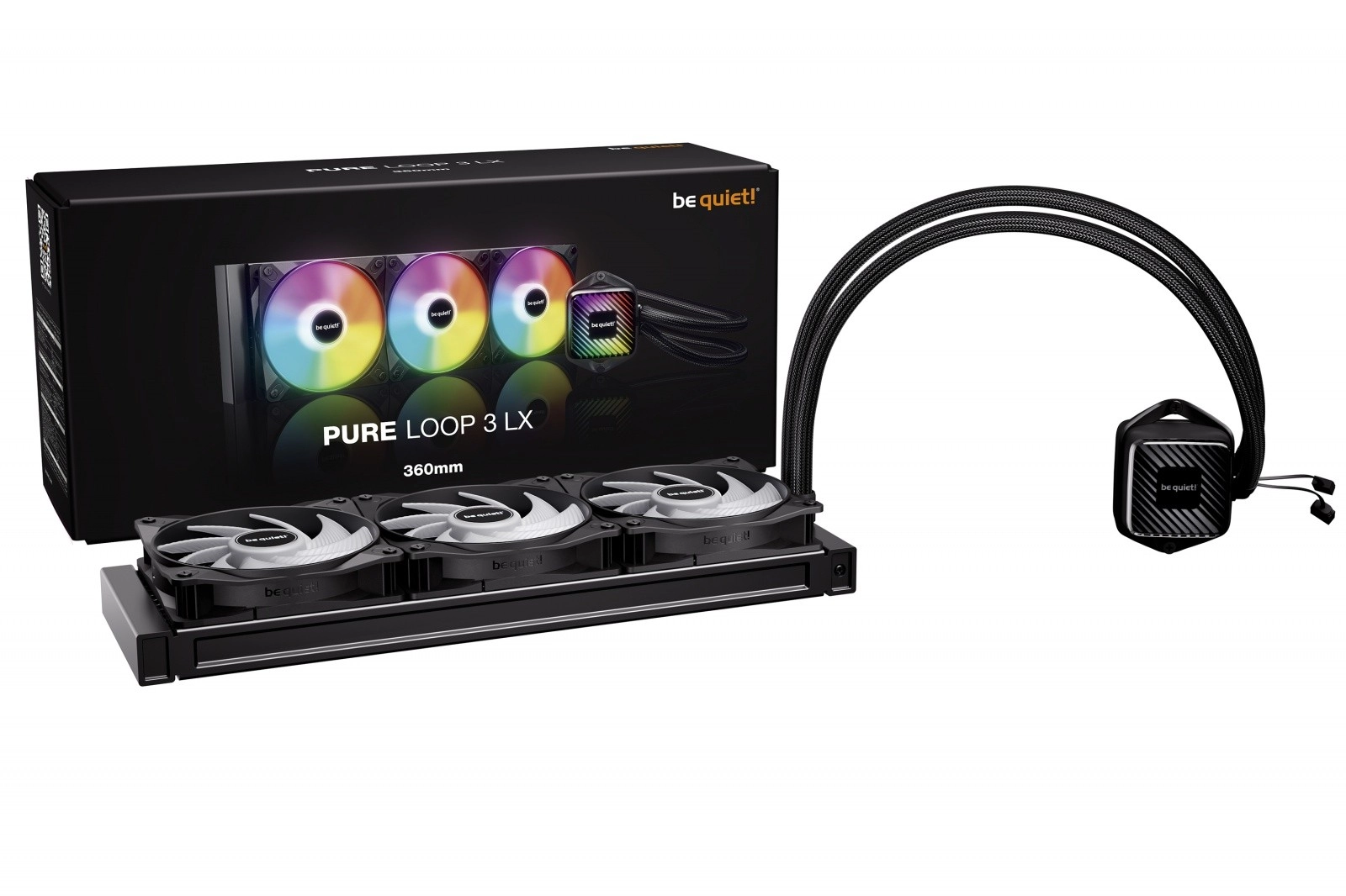 Pure Loop 3 LX 360 mm łączy dopracowany design z maksymalnym chłodzeniem. Stylowy blok ARGB z 10 dołączonymi foliami daje szerokie możliwości personalizacji wyglądu. Trójka wentylatorów Light Wings LX 120 mm PWM high‑speed z 16 diodami LED i łopatkami zoptymalizowanymi pod przepływ zapewnia wysoką wydajność i niską głośność, a wyloty o kształcie leja maksymalizują przepływ powietrza przez gęsty, 360‑mm żeberkowy radiator.