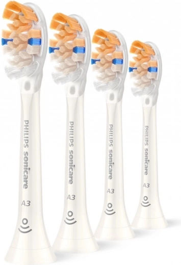 Wymienne główki PHILIPS Sonicare A3 All‑in‑One zostały zaprojektowane z myślą o maksymalnej skuteczności i komforcie. Specjalnie ukształtowane pęczki włókien o trójkątnym profilu zwiększają kontakt z powierzchnią zęba dla szybkiego usuwania przebarwień, a dłuższe boczne włókna dbają o linię dziąseł. Technologia soniczna przenosi działanie czyszczące także do przestrzeni międzyzębowych i wzdłuż krawędzi dziąseł.