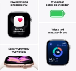 APPLE WATCH SERIES 11 przenosi smartwatche na wyższy poziom: to najcieńsza generacja zapewniająca komfort całodobowego noszenia, aby monitoring zdrowia był maksymalnie precyzyjny. Ulepszona wytrzymałość do 24 godzin na jednym ładowaniu (i do ~8 godzin po ok. 15 minutach szybkiego ładowania) dotrzyma kroku Twojemu dniu. Ekran Ion‑X jest dwukrotnie bardziej odporny na zarysowania niż w Series 10, a konstrukcja spełnia normy wodoszczelności WR 50M i pyłoszczelności IP6X.