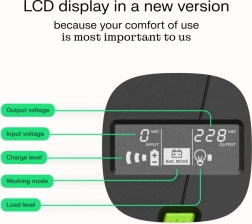 - Wyświetlacz LCD – jasne informacje o obciążeniu, baterii i stanie sieci.