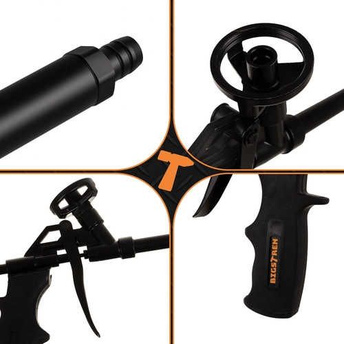 Wytrzymałe całkowicie metalowe body zapewnia niezawodność i długą żywotność nawet przy intensywnym użytkowaniu. Ergonomiczna rękojeść z antypoślizgową powierzchnią wygodnie leży w dłoni i minimalizuje zmęczenie podczas dłuższej pracy. Pistolet jest kompatybilny z większością standardowych puszek z pianą PU.
