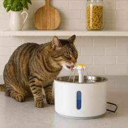 Wkład filtrujący z węglem aktywnym na bieżąco usuwa kurz, sierść i drobne zanieczyszczenia. Proste zasilanie USB (DC 5 V / 1 A) oraz niskie zużycie 1,5 W umożliwiają cichą pracę przez cały dzień. Pojemność 2,4 l jest idealna dla kotów oraz małych i średnich psów.