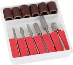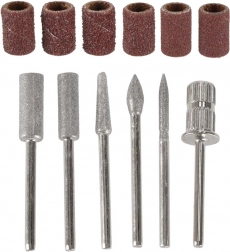 - Bogate wyposażenie: 6 metalowych frezów (szpiczasty, walcowy, stożkowy, kulkowy, igłowy, trzpień do kapturków) + 6 nakładek ściernych o różnej gradacji.