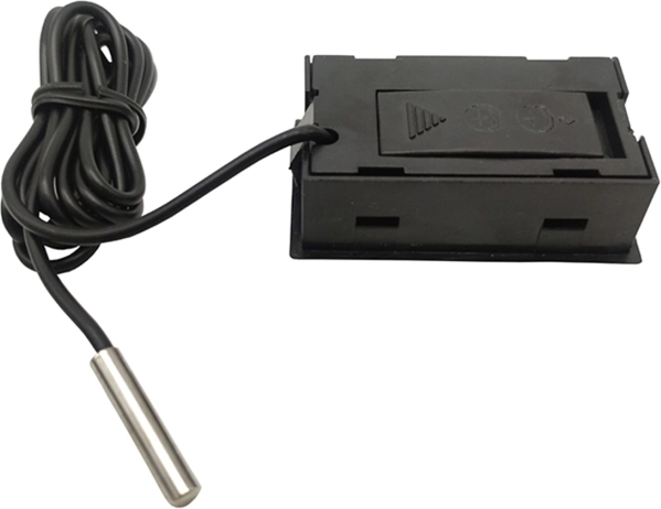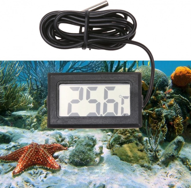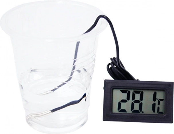 Elektroniczny termometr z dużym wyświetlaczem LCD i sondą na długim kablu. Sondę (czujnik) można umieścić praktycznie wszędzie, np. w akwarium, terrarium, lodówce, zamrażarce, szklarni itd. Wszędzie tam, gdzie potrzebujesz precyzyjnego pomiaru temperatury w zakresie od -50 do 70 stopni Celsjusza!