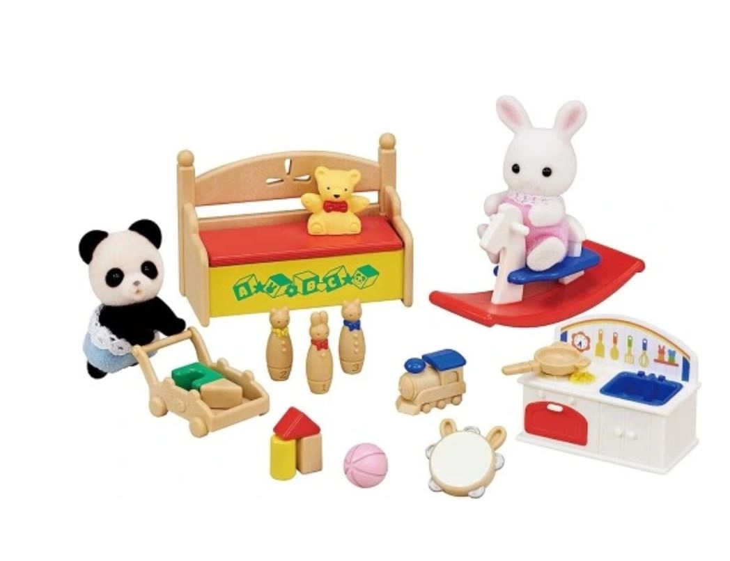 W komplecie znajdują się różnorodne akcesoria do zabawy w przedszkole i dom: huśtawka w formie konika na biegunach, klocki, kręgle, tamburyn oraz kuchenka ze zlewem. Nie zabrakło ławki ze skrzynią na zabawki do sprzątania po zabawie. Każdy element wykonano z naciskiem na jakość i bezpieczeństwo, charakterystyczne dla SYLVANIAN FAMILIES.