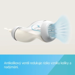 Specjalny zawór uwalnia powietrze z butelki i utrzymuje stały przepływ mleka, aby maluszek pił płynnie, bez połykania powietrza.
