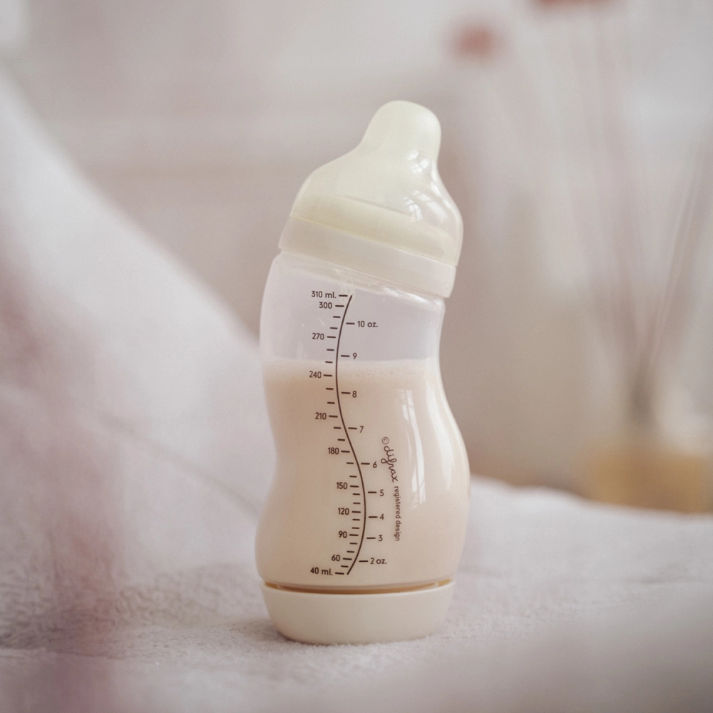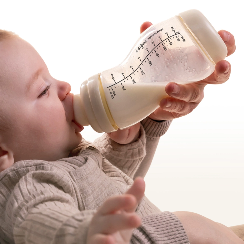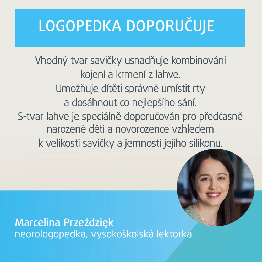 Unikalny S-Shape utrzymuje smoczek pełny mleka nawet pod kątem i zwiększa komfort dla rodzica i dziecka.