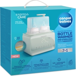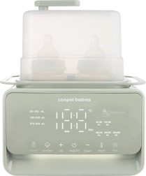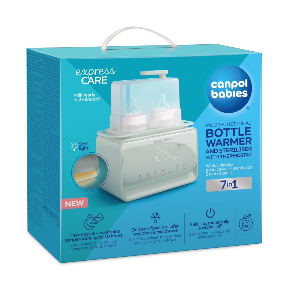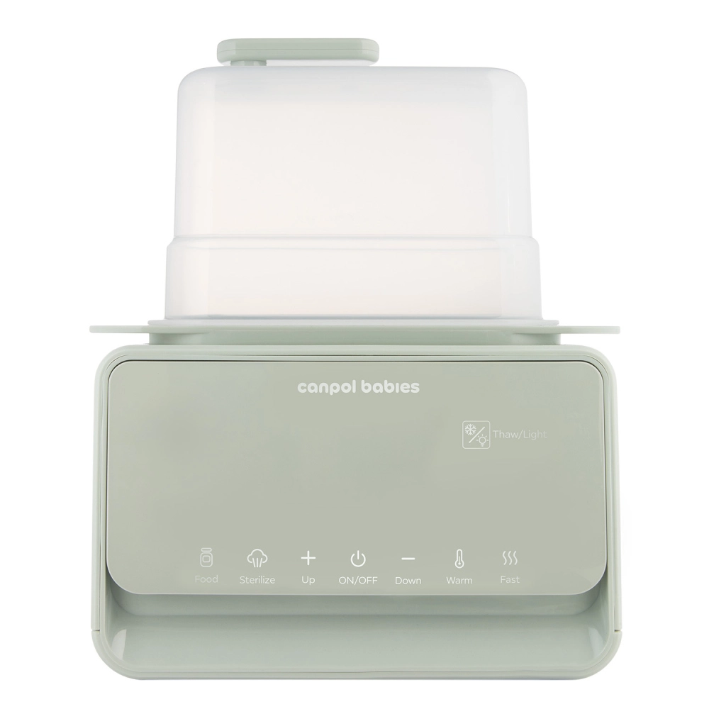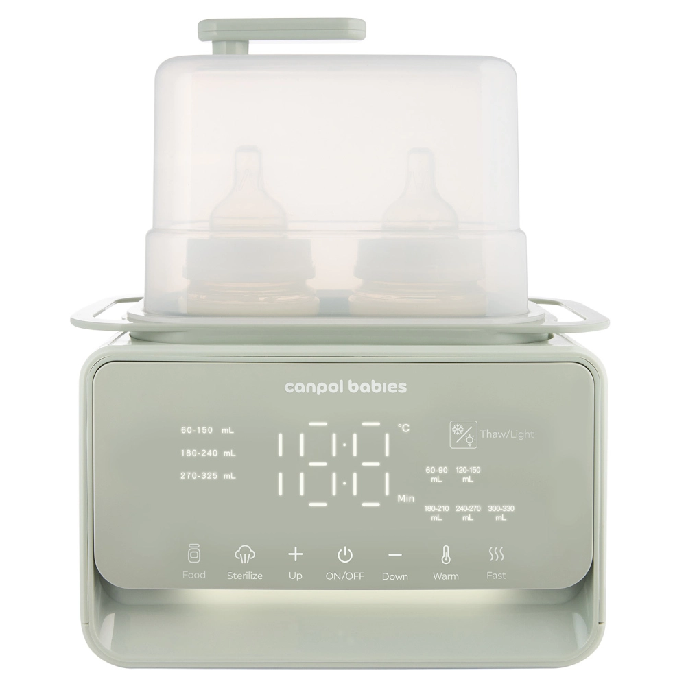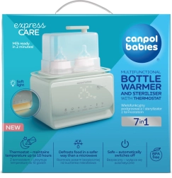 Elektryczny podgrzewacz i sterylizator Canpol babies 7w1 niezawodnie przygotuje mleko mamy i dania dla dzieci do idealnej temperatury w kilka minut. Wbudowany termostat utrzymuje wybraną temperaturę nawet do 10 godzin, także przy jednoczesnym podgrzewaniu dwóch butelek. Urządzenie dodatkowo dezynfekuje butelki, smoczki i części laktatorów w 10 minut, dzięki czemu wszystko masz gotowe higienicznie i bez wysiłku.
