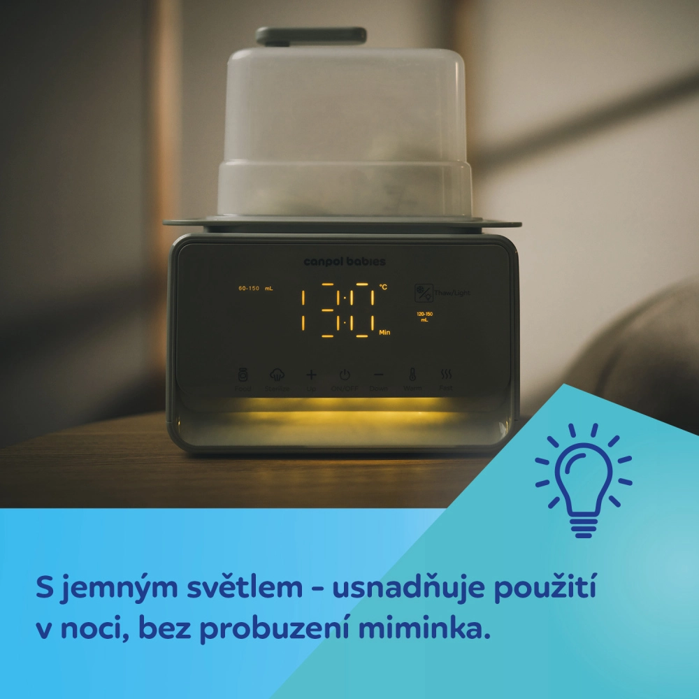 - 7 trybów: podgrzewanie mleka, podgrzewanie posiłków/słoiczków, szybkie podgrzewanie, rozmrażanie, sterylizacja, utrzymanie temperatury, światło nocne