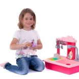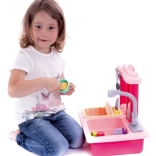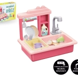 Różowy dziecięcy zlew na naczynia z bateriowym kranem i akcesoriami