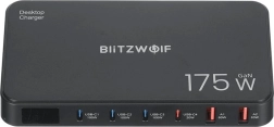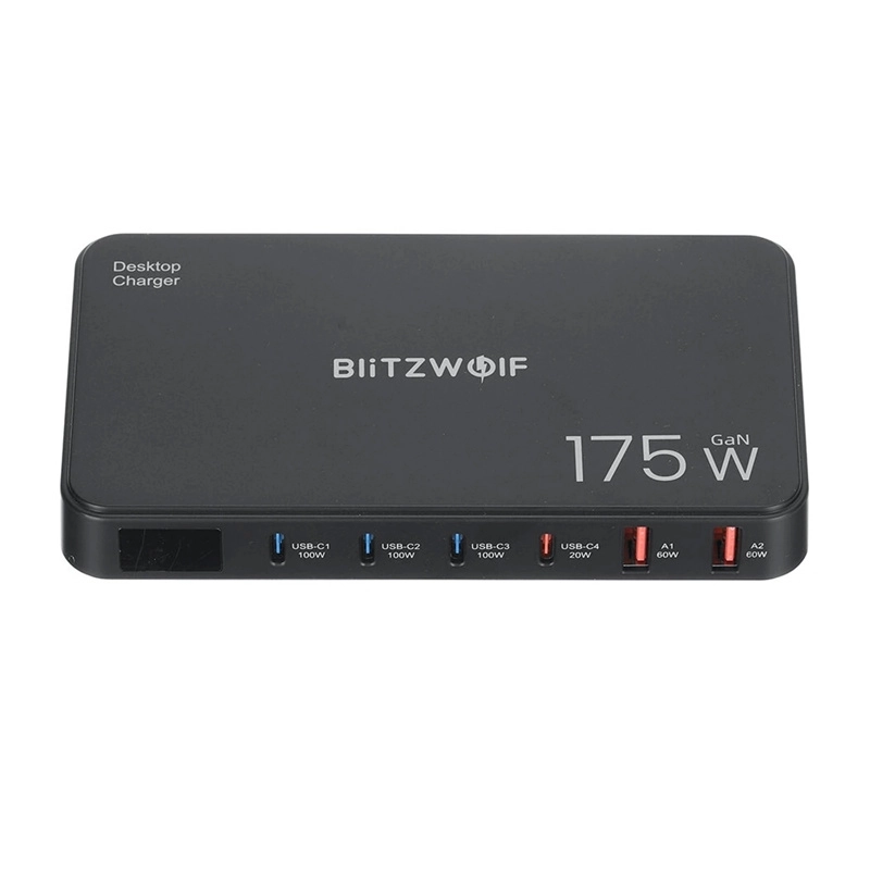 Kompaktowa biurkowa ładowarka BlitzWolf z technologią GaN oferuje łączną moc do 175 W i umożliwia jednoczesne zasilanie aż 6 urządzeń przez 4× USB‑C i 2× USB‑A. Wspiera szeroką gamę protokołów szybkiego ładowania (PD 3.0, PPS, QC 4+ itp.), ma inteligentne zarządzanie mocą oraz niezawodną ochronę przed przepięciem, przegrzaniem i przeciążeniem – idealna do domu, biura i w podróży.
