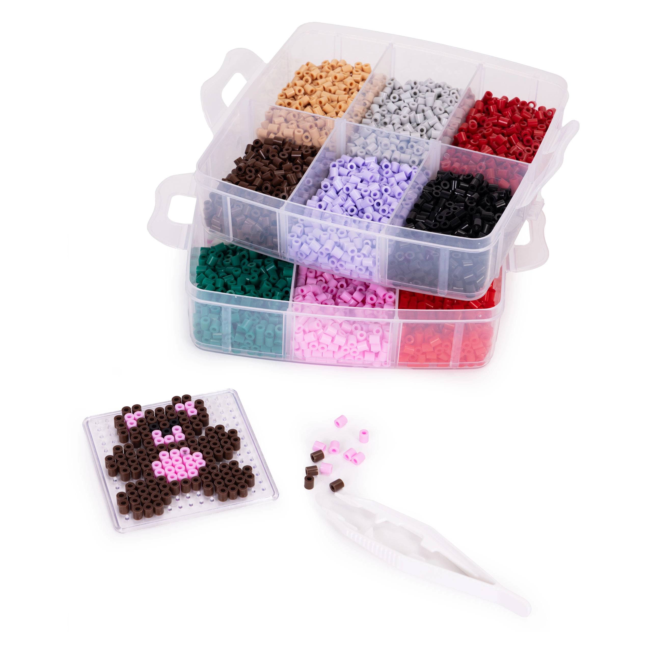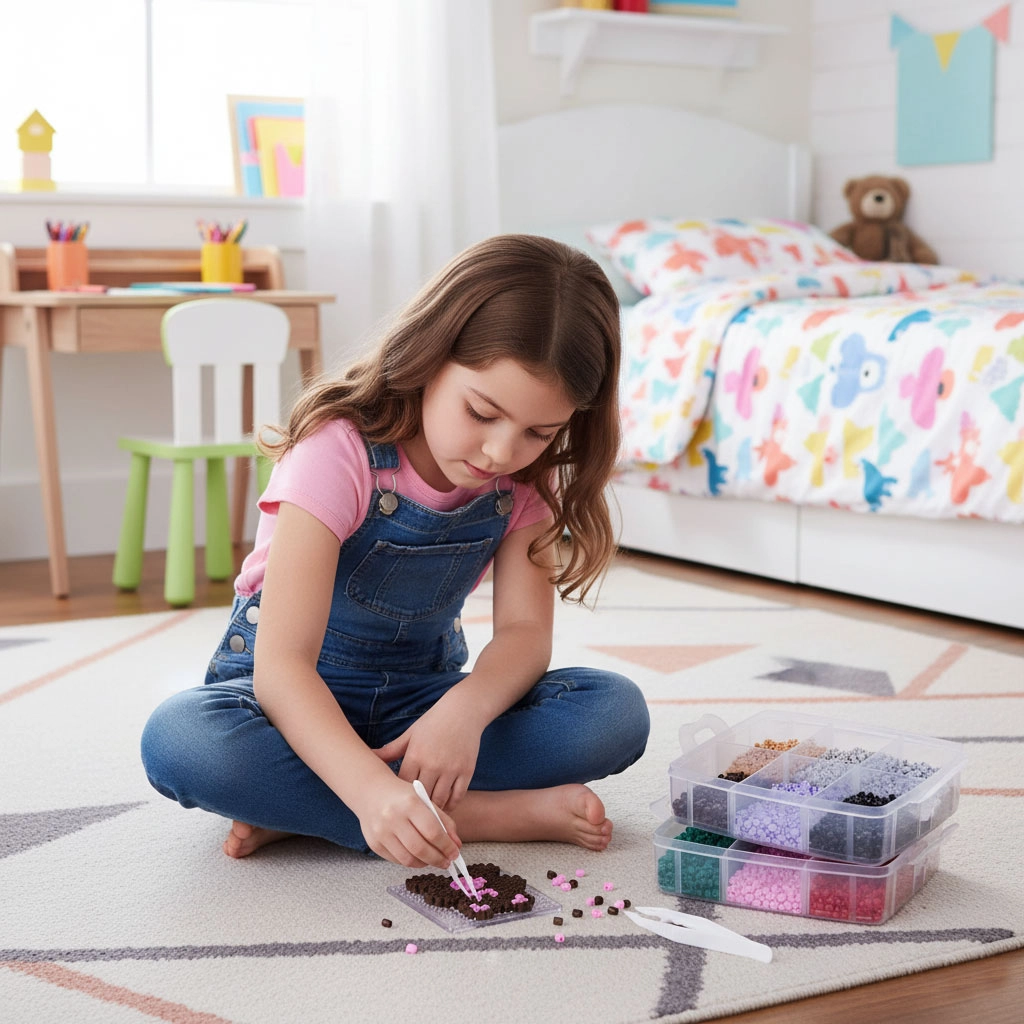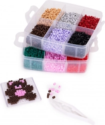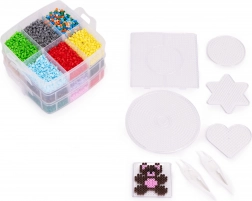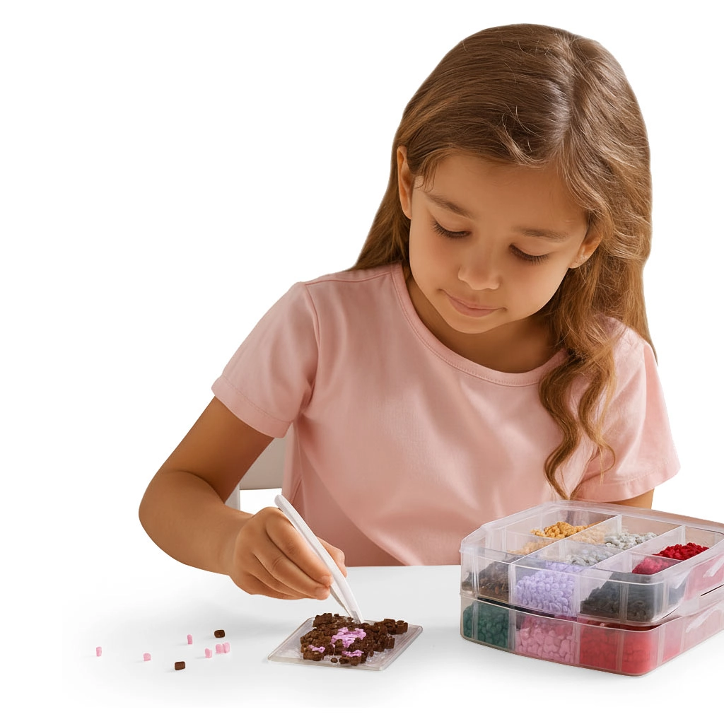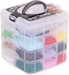 Zawartość opakowania: aż 9000 koralików w wielu kolorach, 6 podstawek (koło, kwadrat, gwiazda, serce itp.), 2 pęsety, papiery do zaprasowywania, szablony projektowe oraz pojemny organizer z przegródkami. Dzięki piętrowemu boxowi wszystko jest przejrzyście uporządkowane i gotowe na dalsze tworzenie w domu i w podróży.